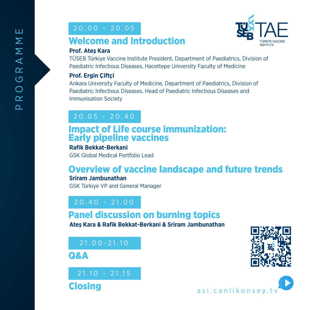 On Monday, September 04, 2023, between 20.00-21.15 pm, Future Vaccines: A Different Perspective presentation and discussion will be held with the presentations of officials from GSK, one of the international vaccine manufacturers. The speakers, Rafik Bekkat-Berkani, GSK Global Medical Portfolio Leader and Sriram JAMBUNATHAN, General Manager of GSK Turkey, will discuss the issues related to the sector's perspective within the framework of the topics of the speech titles "Impacts of Lifelong Vaccination, Future Vaccines and Immunization Outlook".