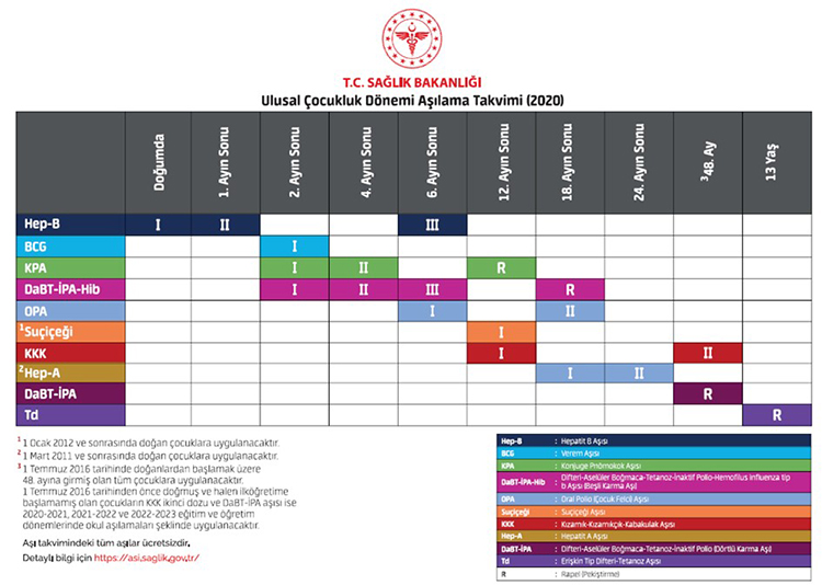 Türkiye’de Hib, pnömokok, kızamık ve boğmacaya uygulanan aşıları ve uygulama zamanlarını içeren Çocukluk Dönemi Aşılama Takvimi aşağıda sunulmuştur.