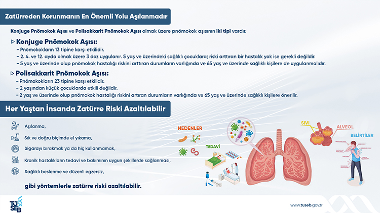 Çocukluk döneminde pnömokokların 13 tipine karşı etkili olan konjuge pnömokok aşısı (KPA) 2. 4. ve 12. aylarda uygulanmaktadır. Aşının 5 yaşın üzerindeki sağlıklı çocuklara uygulanması gerekli değildir. Ancak kronik akciğer hastalığı, diabetes mellitus, orak hücreli anemi, gibi bazı hastalıkları olan bireylerde, 65 yaş ve üzerindeki yetişkinlerde pnömokok hastalığı riski yüksektir. Bu nedenle daha büyük yaşlardaki çocuklara ve yetişkinlere de KPA uygulanması önerilmekte ve ücretsiz olarak aşılama hizmeti sunan sağlık kuruluşlarında uygulanmaktadır. Yanısıra pnömokokların 23 tipine karşı etkili olan polisakkarit pnömokok aşısının ise Sağlık Uygulama Tebliğinde tanımlanan risk gruplarına uygulanmak üzere Sosyal Güvenlik Kurumu tarafından bedeli karşılanmaktadır.