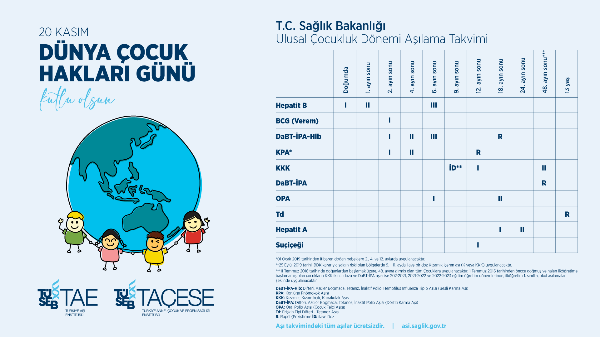 Ülkemizde aşılama hizmetleri, herkesin ulaşabileceği şekilde, sürekli ve ücretsiz olarak sunulmaktadır. Aşılanmalarını sağlayarak çocuklarınızı hastalıklardan ve bu hastalıklar nedeniyle oluşabilecek engellilik durumlarından koruyabilirsiniz.