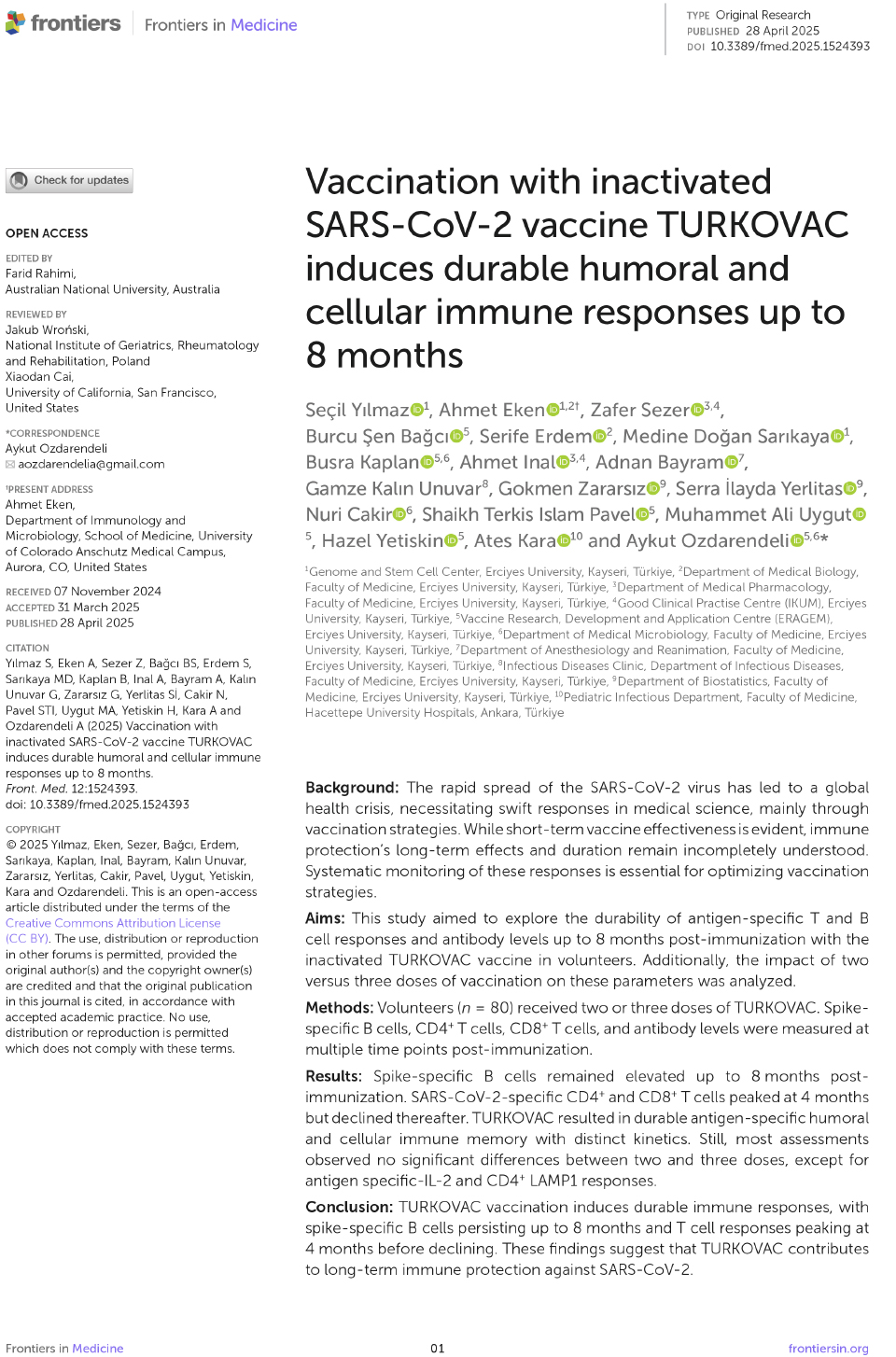 Gönüllülerde inaktif TURKOVAC aşısıyla bağışıklamadan sonraki 8 aya kadar antijen-spesifik T ve B hücre yanıtlarının ve antikor seviyelerinin kalıcılığının araştırıldığı, ek olarak iki veya üç doz aşılamanın bu parametreler üzerindeki etkisinin analiz edildiği çalışmanın makalesi 28 Nisan 2025 tarihinde Frontiers Journal, Bulaşıcı Hastalıklar Bölümü: Patogenez ve Tedavi Cilt 12 – 2025 yayınlanmıştır.